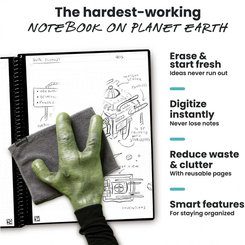 - Многоразовость: 1 блокнот = 1000+ спасенных деревьев. Стирайте страницы микрофибровой салфеткой (в комплекте) и используйте снова.