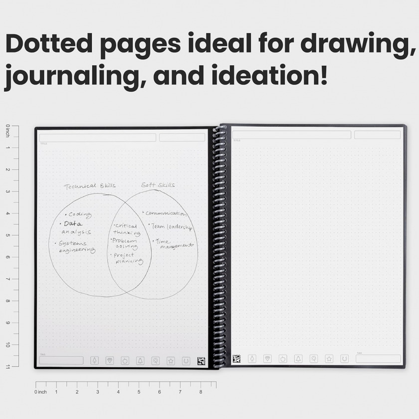 - Две линовки на выбор: Линейка для конспектов или точечная сетка для чертежей — каждая страница единообразна.