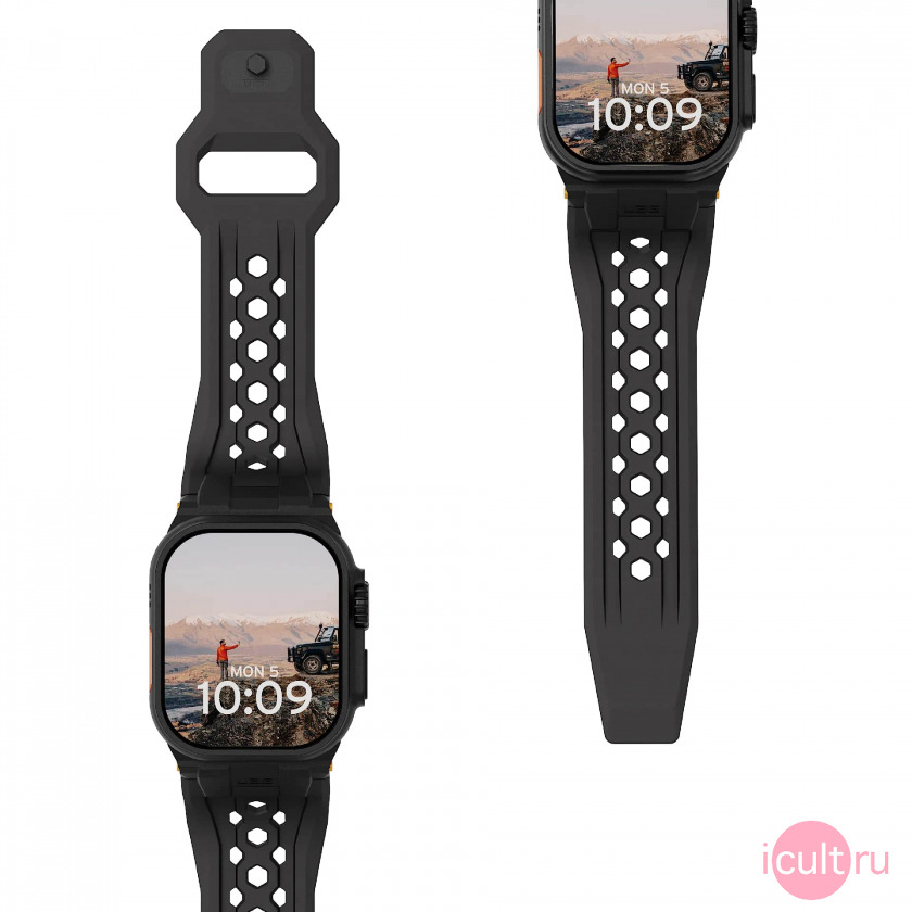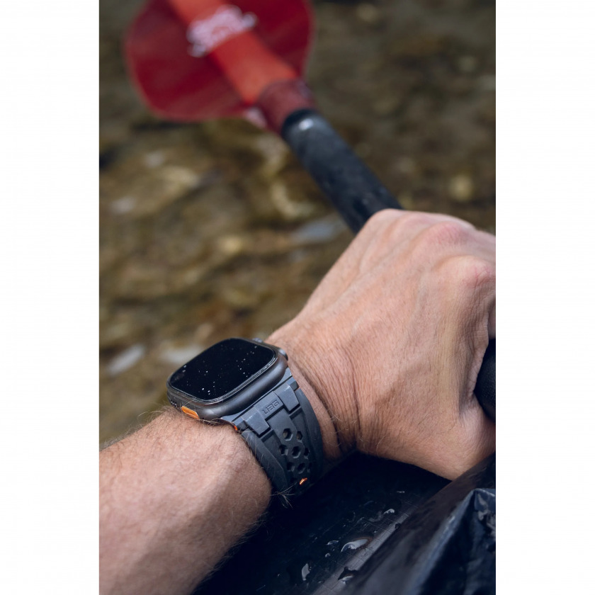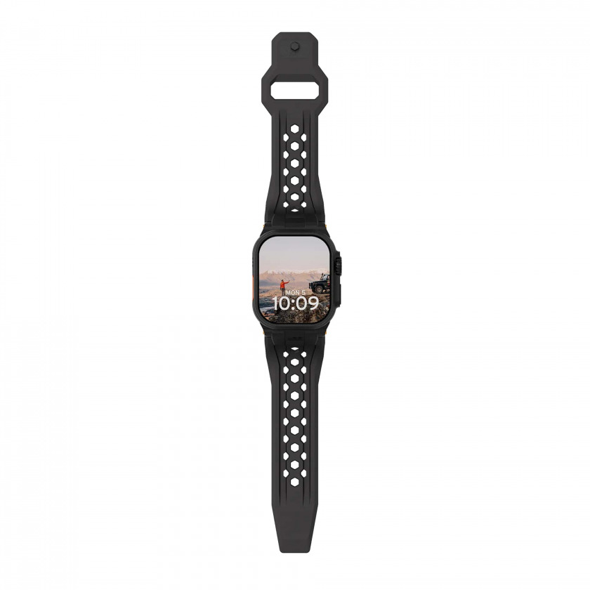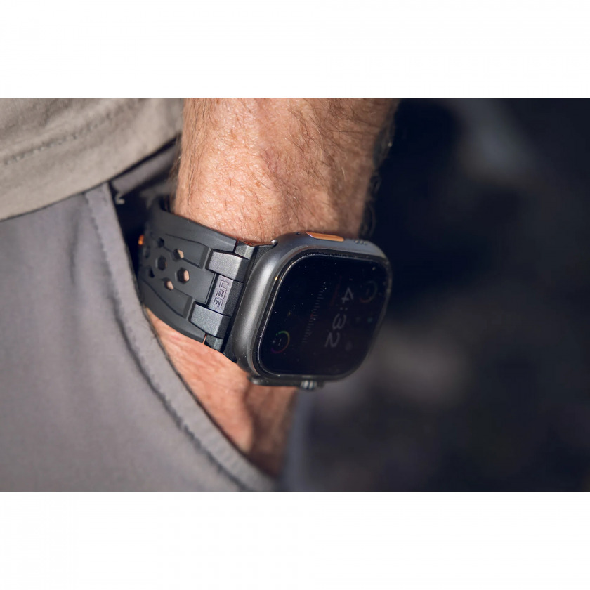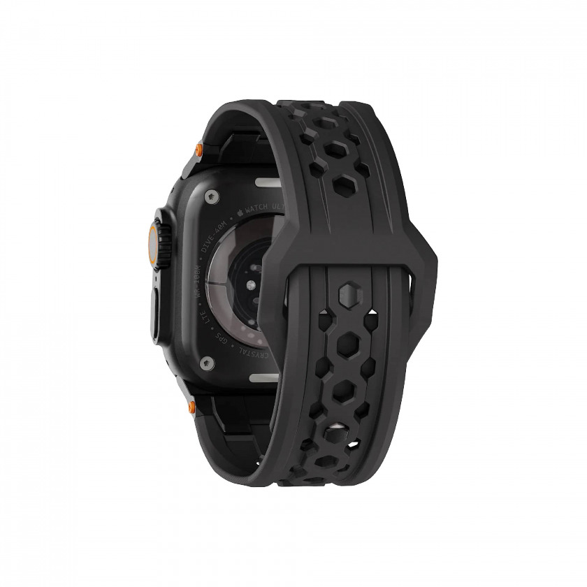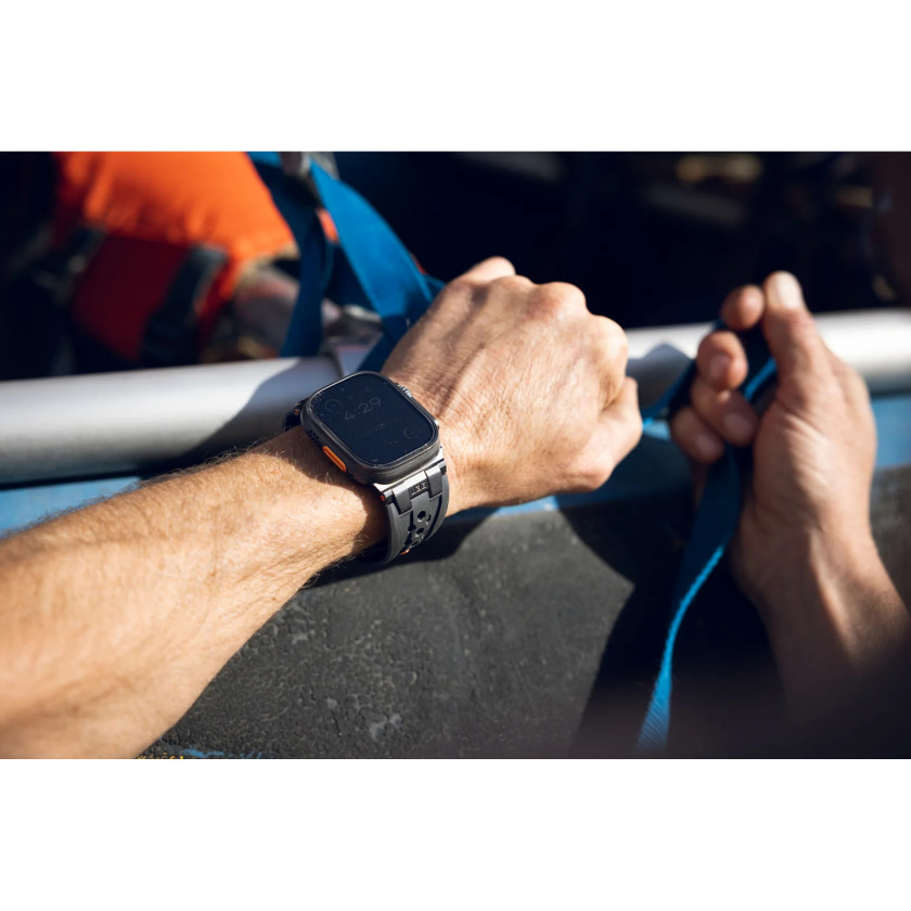 Проложите свой путь с ремешком для Apple Watch Monarch — идеальным сочетанием высокой прочности и первоклассного мастерства. Этот ремешок, созданный для тех, кто ценит долговечность без ущерба для стиля, способен выдерживать любые погодные условия и при этом подчеркивать ваш внешний вид. Изготовленные из высококачественного фторэластомера FKM, Monarch обеспечивают превосходную производительность в любых условиях. Ремешок устойчив к воздействию экстремальных температур, химических веществ, ультрафиолетовых лучей, воды и пыли, что делает его идеальным спутником для прогулок на свежем воздухе. Изготовленная на заказ фурнитура из нержавеющей стали титанового цвета придает изделию изысканности, обеспечивая при этом долговечность, на которую вы можете рассчитывать. Система застежек-защипов обеспечивает надежность и гладкость ремешка, предотвращая его зацепление и аккуратно убирая излишки ремешка, обеспечивая комфорт в течение всего дня. Перфорированный дизайн улучшает циркуляцию воздуха, помогая вам сохранять прохладу, а яркие акцентные цвета придают модели современный вид. Грубый. Утонченный. Монарх.