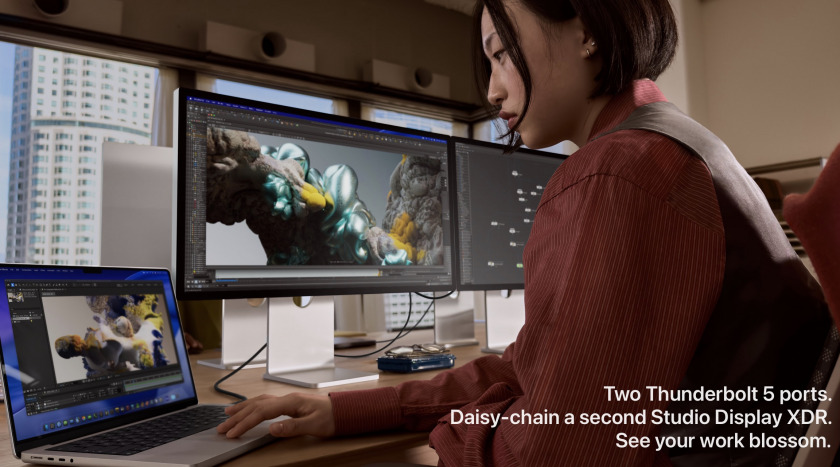 Второй Thunderbolt 5 порт позволяет подключать дополнительные устройства или организовывать цепочку (daisy chain) до четырёх мониторов Studio Display XDR последовательно.