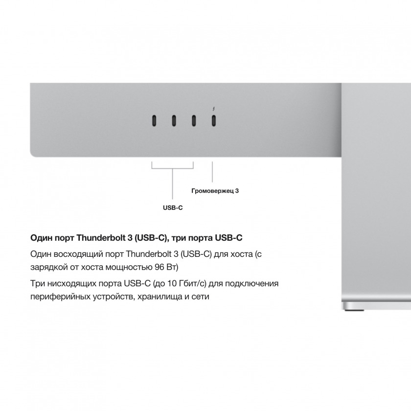 Главное техническое обновление — переход на Thunderbolt 5 . Монитор оснащён двумя портами Thunderbolt 5 (один восходящий для подключения к Mac, один нисходящий для периферии) и двумя портами USB-C (10 Гбит/с).