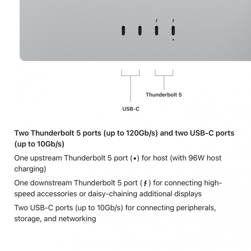 Главное техническое обновление — переход на Thunderbolt 5 . Монитор оснащён двумя портами Thunderbolt 5 (один восходящий для подключения к Mac, один нисходящий для периферии) и двумя портами USB-C (10 Гбит/с).