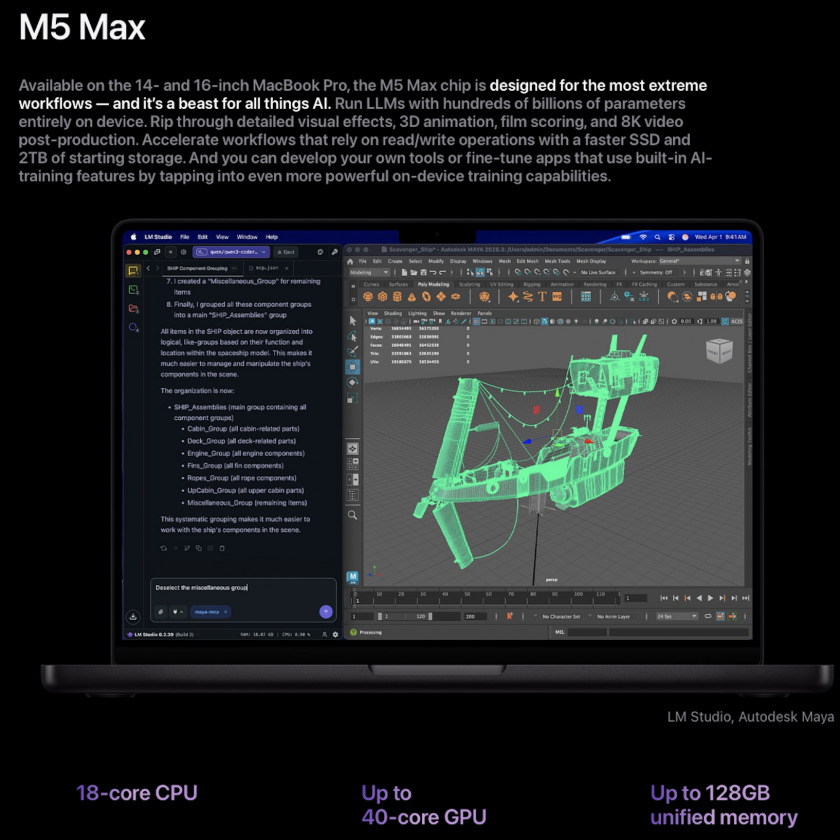 · M5 Max: 18-ядерный CPU (6 суперъядер + 12 производительных ядер), до 40-ядерного GPU, пропускная способность памяти до 614 ГБ/с, поддержка до 128 ГБ объединенной памяти.