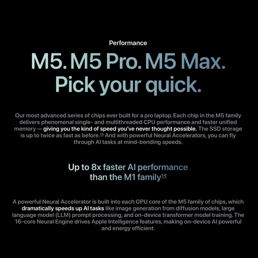 · Базовая комплектация: 1 ТБ для M5 Pro, 2 ТБ для M5 Max.