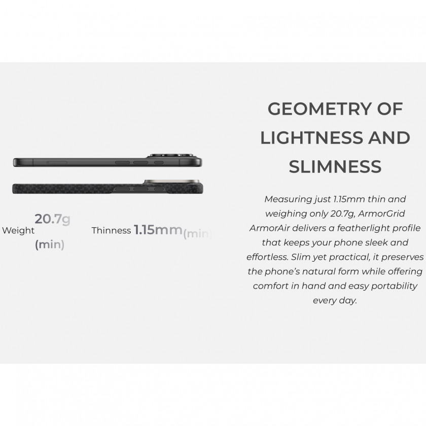 Чехол ArmorAir Case, изготовленный из натурального волокна DuPont™ Kevlar®, сочетает в себе ультралегкую конструкцию, минималистичную эстетику и изысканную текстуру премиум-класса, что придает вашему iPhone 17 элегантный вид.