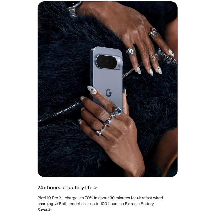 · Pixel 10 Pro XL: 5200 мАч + проводная зарядка 45 Вт, беспроводная 25 Вт (Qi2)
