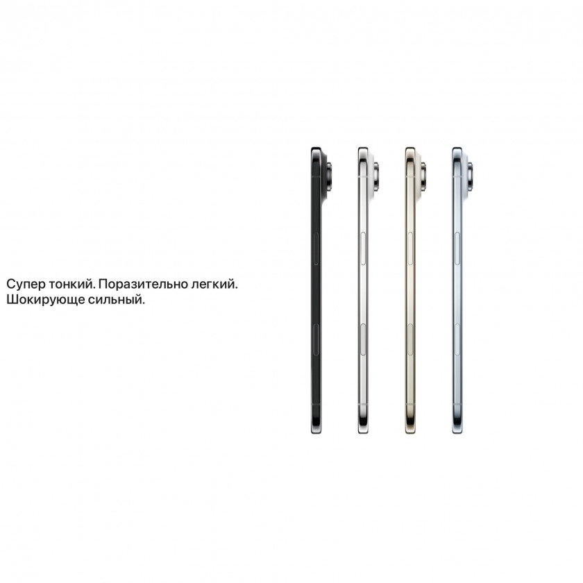 iPhone 17 Air — самый тонкий и легкий iPhone в истории Apple. Толщина корпуса составляет всего 5.64 мм, а вес — 165 грамм. Корпус выполнен из титана с глянцевой шлифовкой граней, что обеспечивает повышенную прочность и премиальный внешний вид. Задняя панель и фронтальное стекло защищены Ceramic Shield (первое поколение на задней панели и Ceramic Shield 2 на экране), что в 3 раза повышает устойчивость к царапинам по сравнению с предыдущими моделями. Цвета: черный, белый, светло-золотой и небесно-голубой.