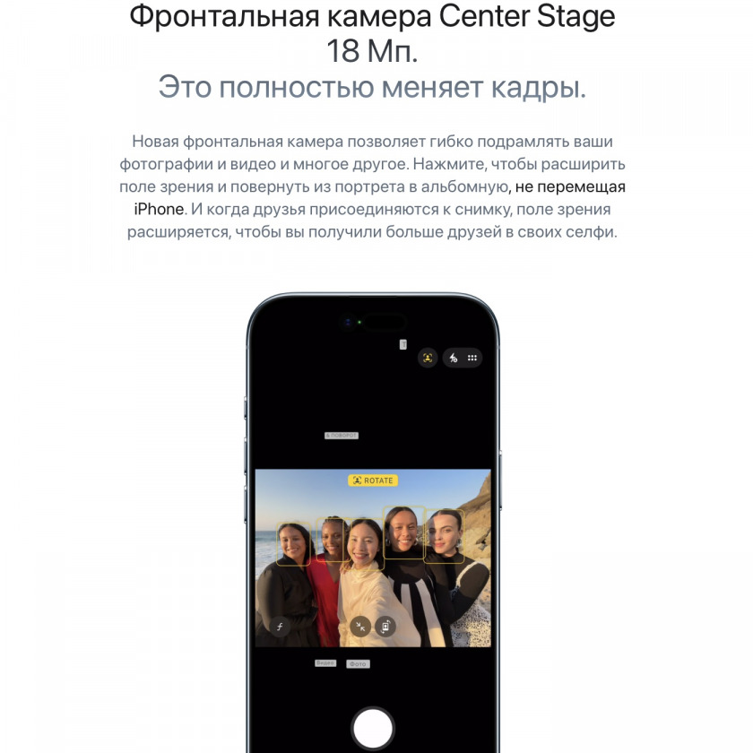 — Фронтальная камера 18 МП с квадратным сенсором и функцией Center Stage — автоматическое кадрирование при селфи и видеозвонках, поддержка съемки в портретной и ландшафтной ориентации без поворота устройства