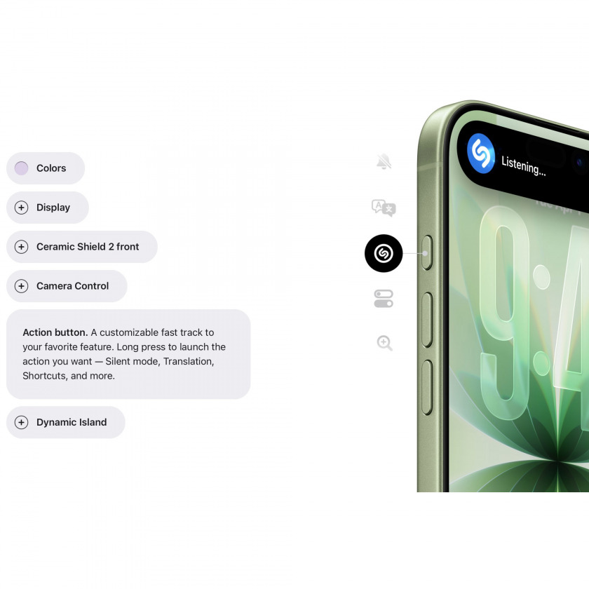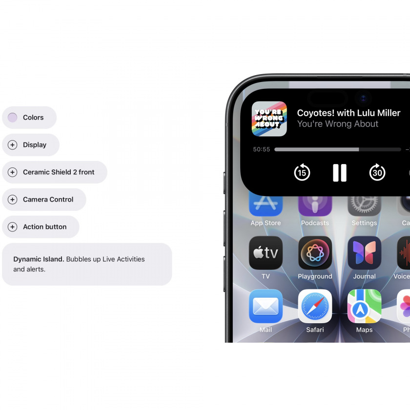 Диагональ дисплея увеличена до 6.3 дюймов (Super Retina XDR OLED), что на 0.2 дюйма больше, чем у iPhone 16. Разрешение составляет 2622 × 1206 пикселей (плотность 460 PPI). Экран поддерживает технологию ProMotion с адаптивной частотой обновления 1–120 Гц для плавной анимации и энергоэффективности, а также функцию Always-On для отображения времени и уведомлений. Пиковая яркость достигла 3000 нит — это рекордный показатель для базовых моделей iPhone, обеспечивающий отличную видимость даже под прямым солнцем. Защитное стекло Ceramic Shield 2 в 3 раза устойчивее к царапинам и бликам по сравнению с предыдущими поколениями.