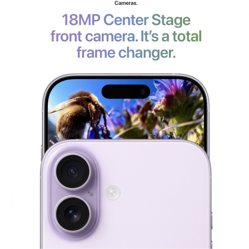 iPhone 17 оснащен полностью обновленной системой камер. Основная двойная камера включает 48 МП широкоугольный объектив (ƒ/1.6) и 48 МП сверхширокоугольный объектив (ƒ/2.2, угол обзора 120°), что обеспечивает детальную съемку даже в условиях низкой освещенности и поддерживает макросъемку. Фронтальная камера 18 МП с квадратным сенсором и функцией Center Stage позволяет делать селфи в портретной и ландшафтной ориентации без поворота устройства, а также автоматически расширяет поле зрения для групповых фото. Для видео доступны режимы 4K Dolby Vision (до 60 кадров/с), Cinematic mode и Dual Capture (одновременная запись на обе камеры).