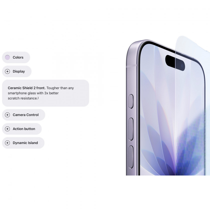 Диагональ дисплея увеличена до 6.3 дюймов (Super Retina XDR OLED), что на 0.2 дюйма больше, чем у iPhone 16. Разрешение составляет 2622 × 1206 пикселей (плотность 460 PPI). Экран поддерживает технологию ProMotion с адаптивной частотой обновления 1–120 Гц для плавной анимации и энергоэффективности, а также функцию Always-On для отображения времени и уведомлений. Пиковая яркость достигла 3000 нит — это рекордный показатель для базовых моделей iPhone, обеспечивающий отличную видимость даже под прямым солнцем. Защитное стекло Ceramic Shield 2 в 3 раза устойчивее к царапинам и бликам по сравнению с предыдущими поколениями.
