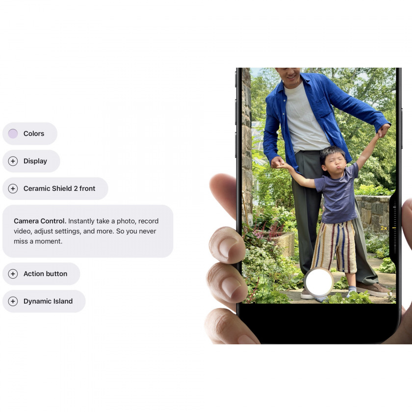 Диагональ дисплея увеличена до 6.3 дюймов (Super Retina XDR OLED), что на 0.2 дюйма больше, чем у iPhone 16. Разрешение составляет 2622 × 1206 пикселей (плотность 460 PPI). Экран поддерживает технологию ProMotion с адаптивной частотой обновления 1–120 Гц для плавной анимации и энергоэффективности, а также функцию Always-On для отображения времени и уведомлений. Пиковая яркость достигла 3000 нит — это рекордный показатель для базовых моделей iPhone, обеспечивающий отличную видимость даже под прямым солнцем. Защитное стекло Ceramic Shield 2 в 3 раза устойчивее к царапинам и бликам по сравнению с предыдущими поколениями.