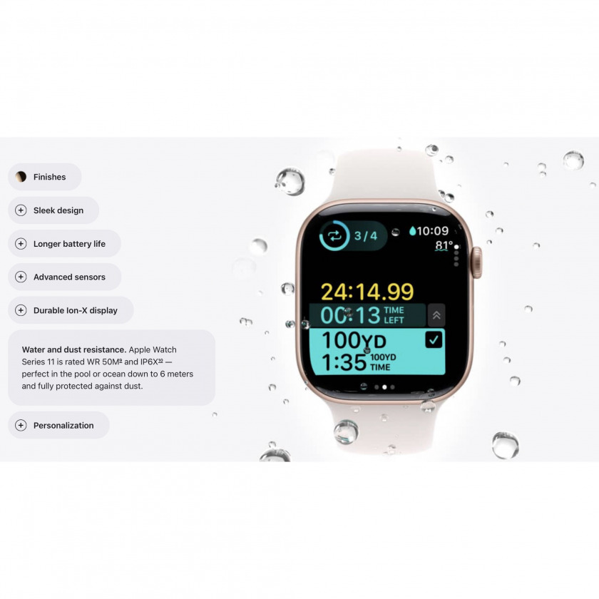 Защита от воды и пыли. Apple Watch Series 11 имеют рейтинг WR 50M* и IP6X1º — идеально подходят для использования в бассейне или океане на глубине до 6 метров и полностью защищены от пыли.