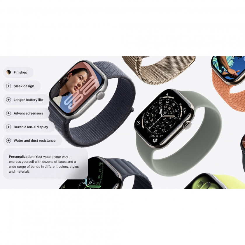 · Стекло сапфирового кристалла: В титановой версии экран защищен сапфировым стеклом — одним из самых прозрачных и устойчивых к царапинам материалов, что гарантирует сохранность безупречного вида дисплея. Для справки: в алюминиевых версиях Series 11 используется стекло Ion-X, которое, по заявлению Apple, стало в 2 раза устойчивее к царапинам, чем у предыдущего поколения.