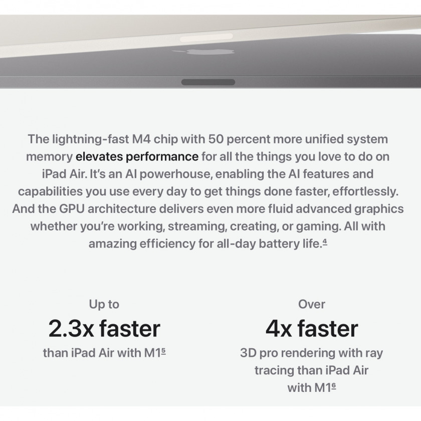 Сердцем нового iPad Air стал 8-ядерный процессор M4 с 9-ядерным графическим ускорителем. Это не просто цифры — это реальная производительность: планшет работает до 30% быстрее модели на M3 и в 2,3 раза быстрее версии на M1. С таким чипом iPad Air вплотную приближается к флагманскому iPad Pro M5, уступая ему всего 15% в производительности, но при этом стоит значительно меньше.